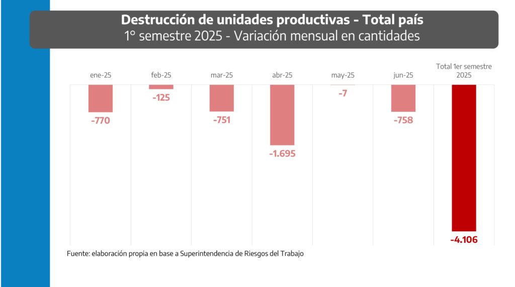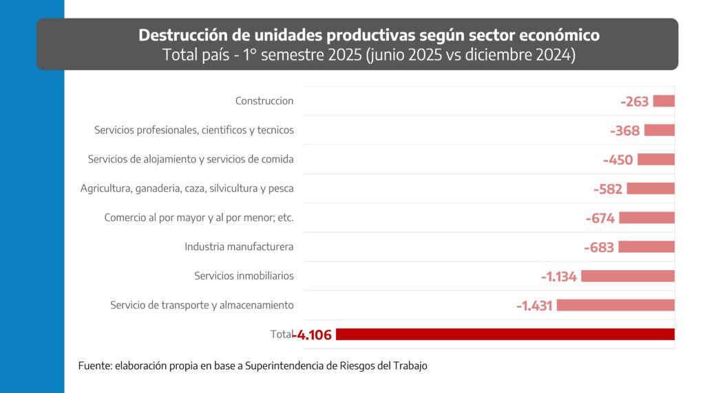 En tanto, en el hilo de mensajes en exTwitter, Pablo López detalló: “La mayoría de los sectores económicos vieron reducido el número de empresas activas en esta primera mitad del 2025: Transporte (-1.431), Servicios inmobiliarios (-1.134), Industria (-683) y Comercio (-674) lideran las pérdidas acumuladas, pero el deterioro es transversal”.