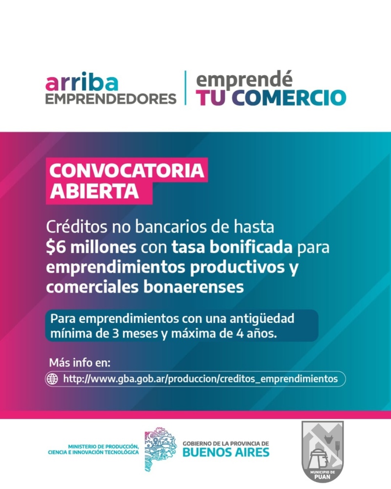 El Municipio de Puan informó que brindará acompañamiento a los interesados que requieran orientación en el proceso de solicitud. Asimismo, quienes deseen conocer las bases y requisitos completos de los programas pueden acceder al sitio web oficial de la provincia: gba.gob.ar/produccion/creditos_emprendimientos.